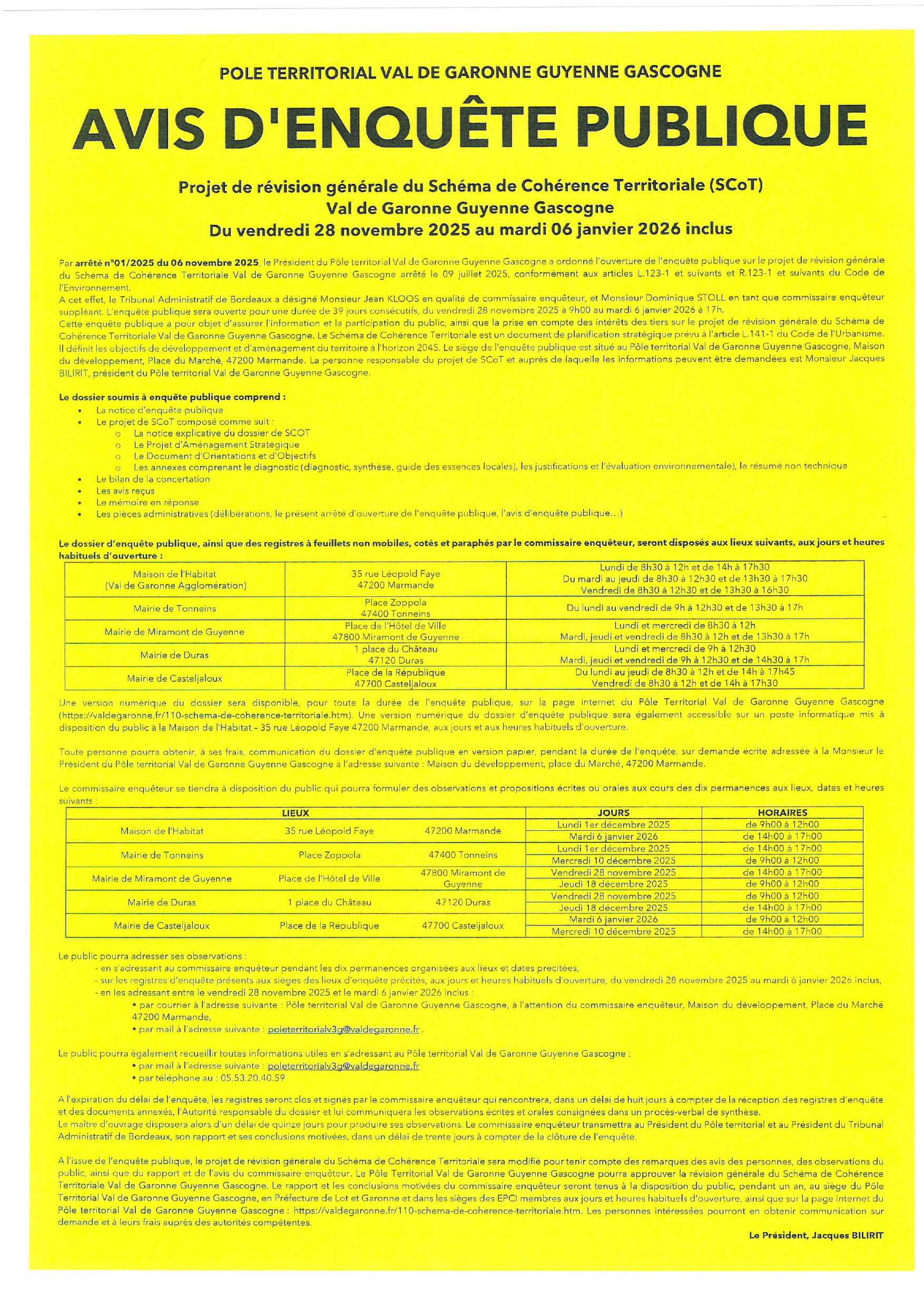 Une enquête publique est en cours concernant le projet de révision générale du Schéma de Cohérence Territorial (SCoT) afin de recueillir les observations des habitants, associations et acteurs du territoire jusqu'au 6 janvier 2026.