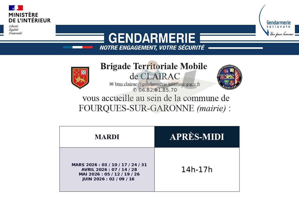 Vous êtes ici : Accueil > PERMANENCES BRIGADE MOBILE DE CLAIRAC
