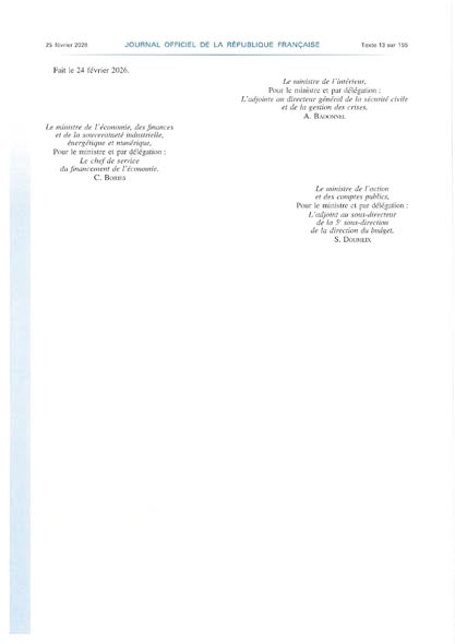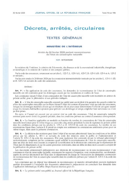 Arrêté du 24 février 2026 portant reconnaissance de l'état de catastrophe naturelle.